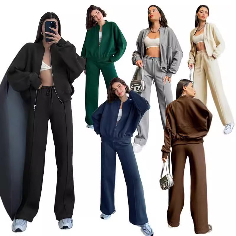 European And American Solid Color Zipper Cardigan Sweater Fashion Casual Set