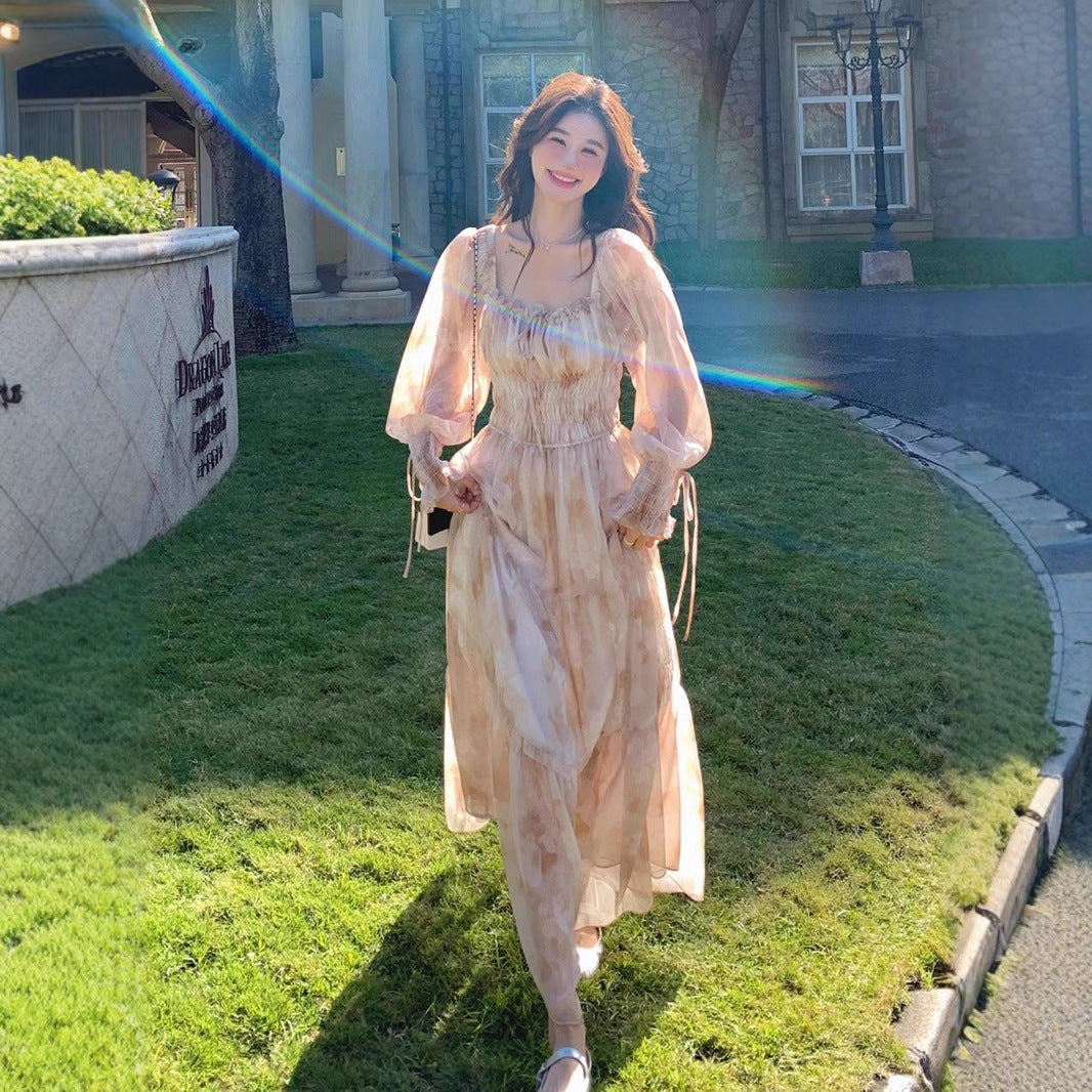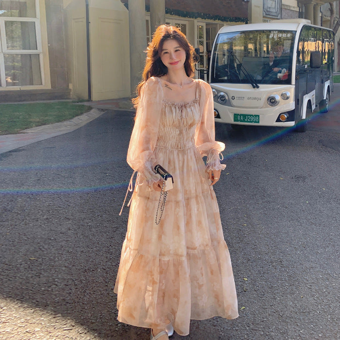 French Square Collar Puff Sleeve Chiffon Floral Dress Women
