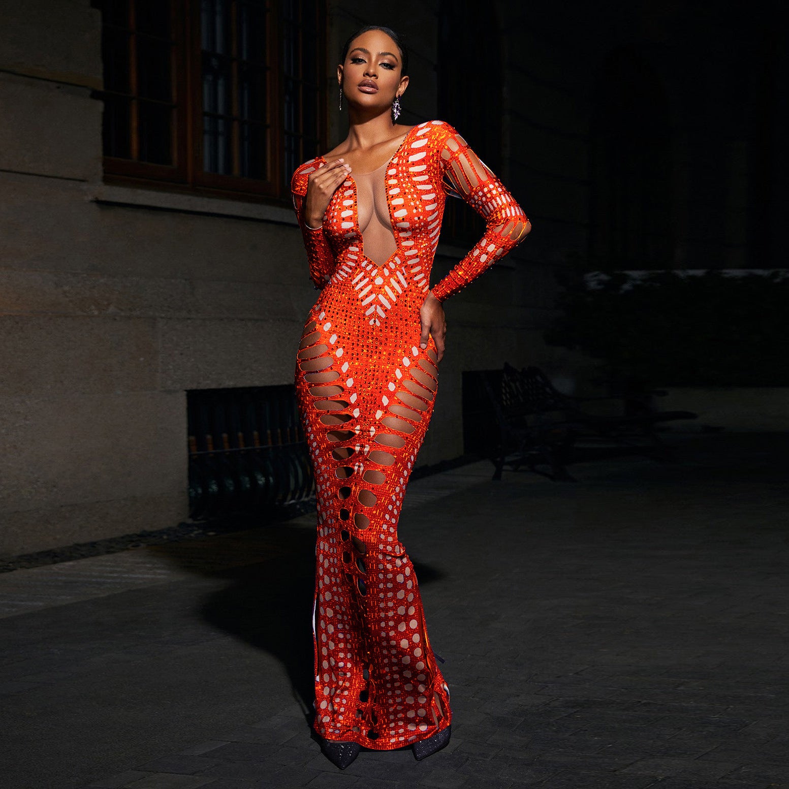 Hole Skinny Sheath Dress Rhinestone Printed Long Skirt