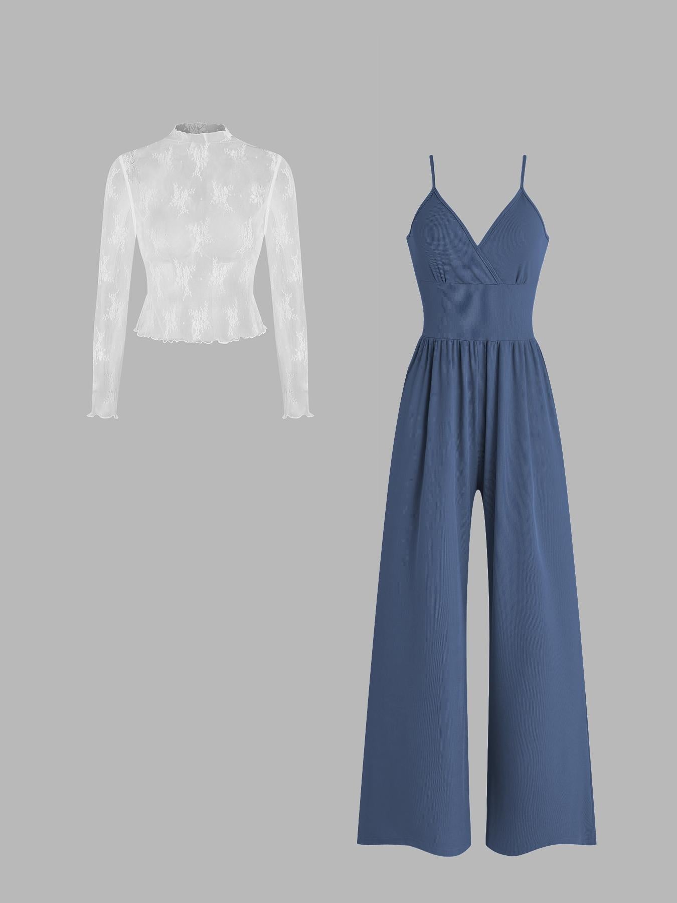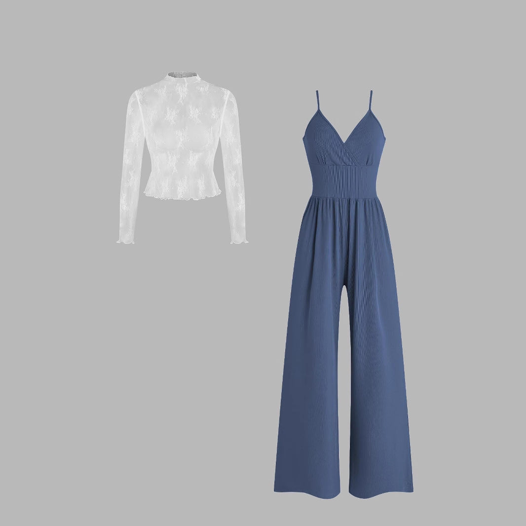 Lace Long Sleeve Sling Slim Fit Bodysuit V-neck Wide Leg Suit
