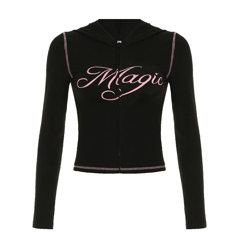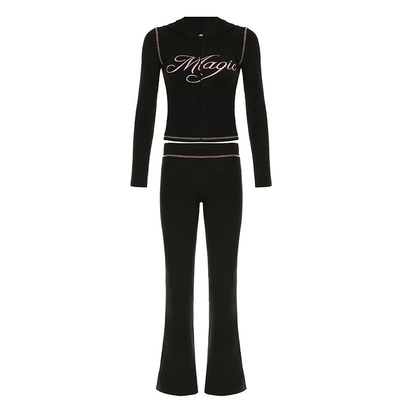 Letter Printing Reverse Car Contrast Color Hooded Zipper Short Sweater Trousers Casual Suit Women