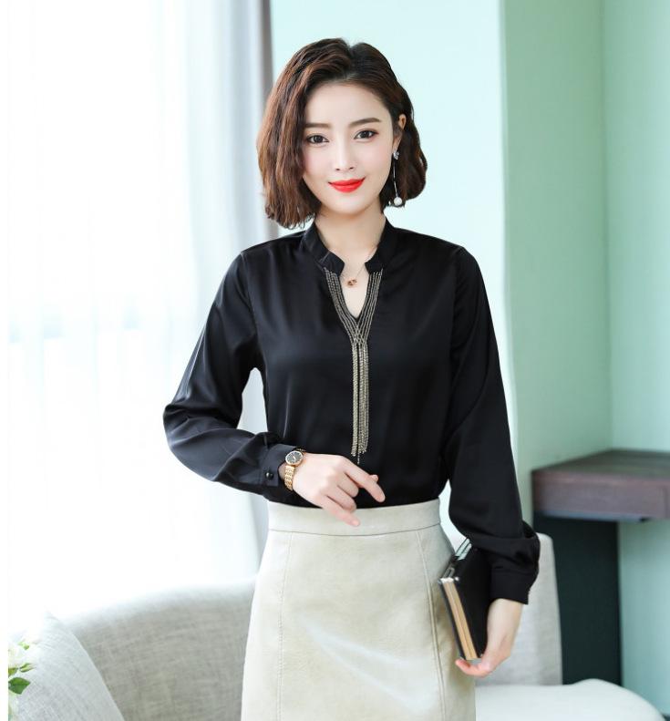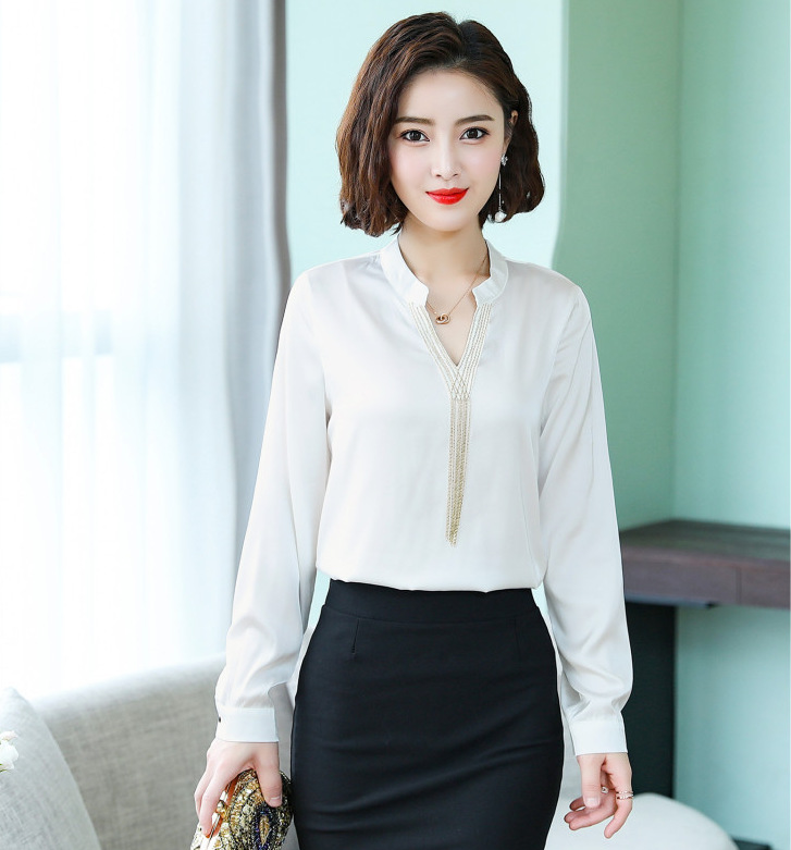 Stretch Satin Shirt Non-Iron V-neck Fringed White Shirt