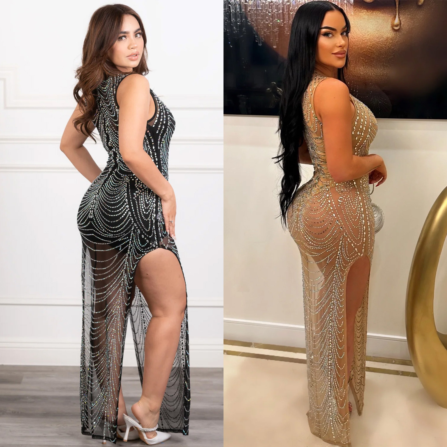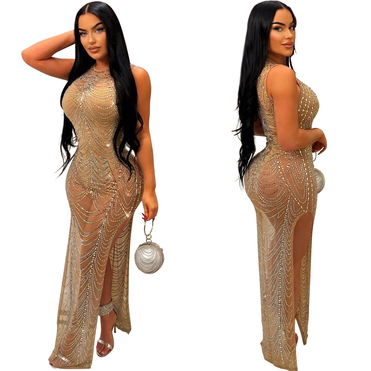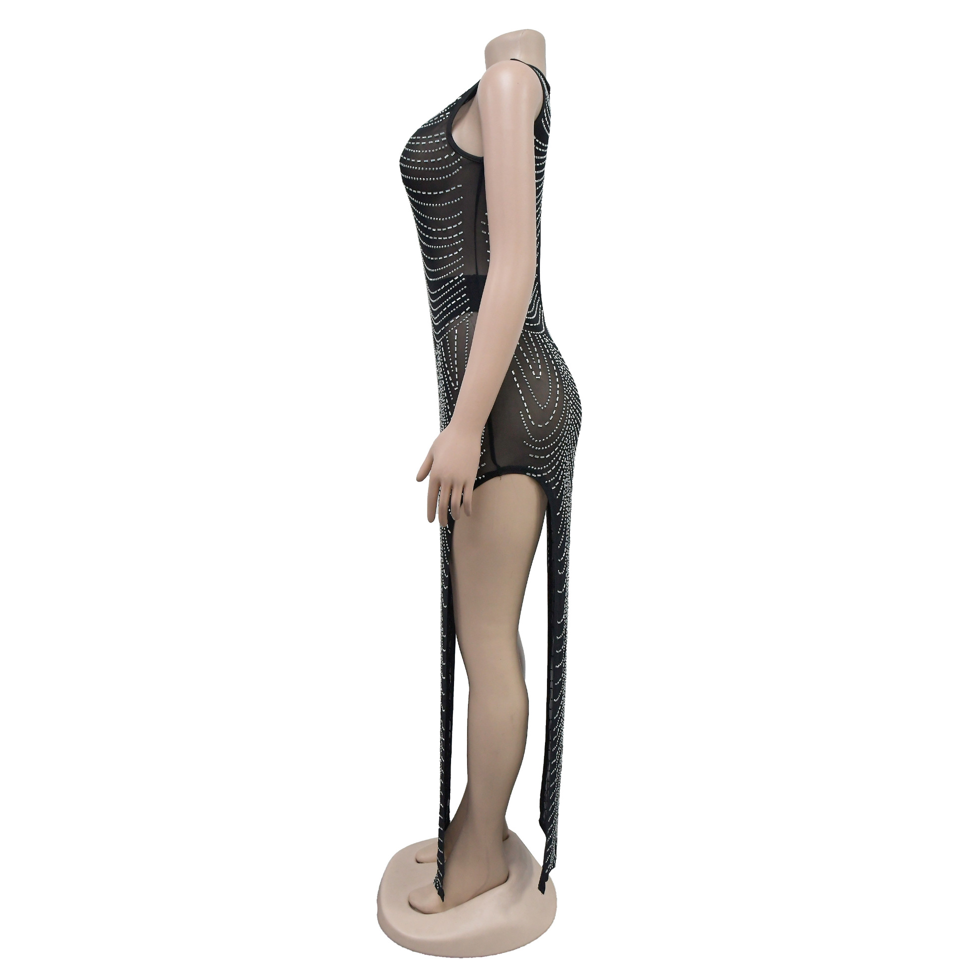 Wear Pure Color Mesh Rhinestone Sleeveless Maxi Dress