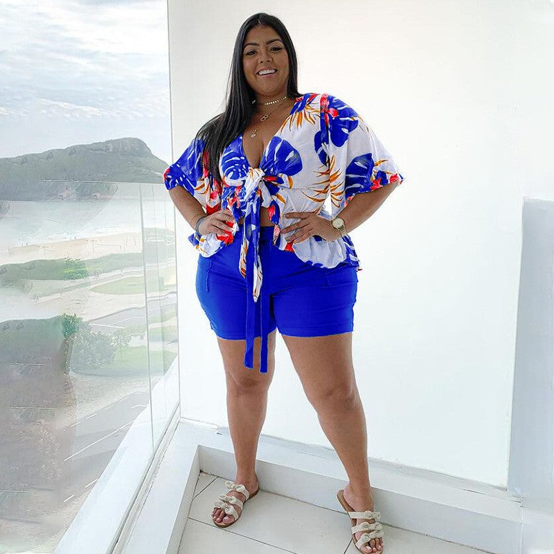 Women's Plus Size Two-piece Suit Printed Casual Cardigan Shorts Suit
